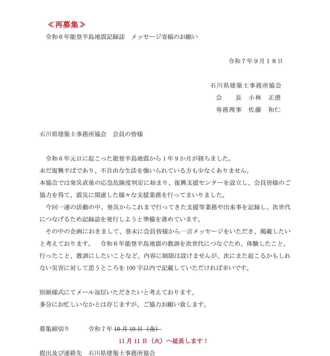 令和6年能登半島地震記録誌発刊にあたり、メッセージ寄稿のお願いをしておりました。