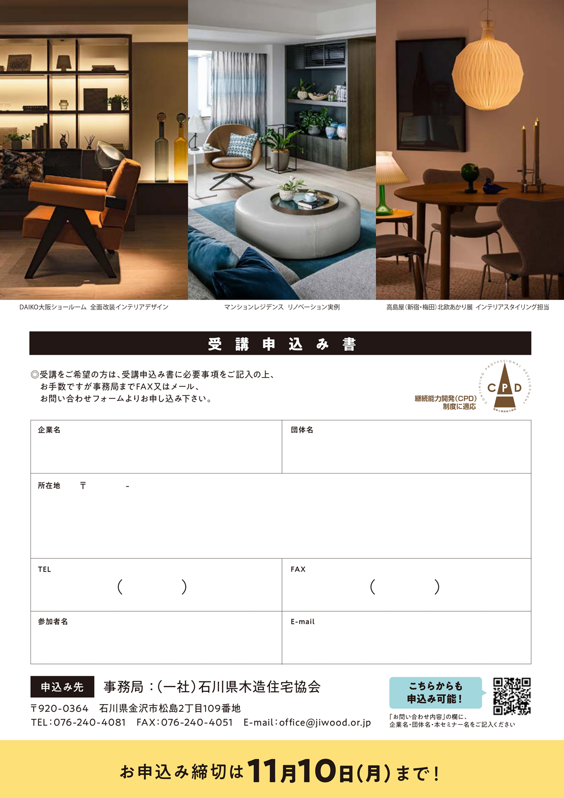 参加ご希望の方は、別紙受講申込み書にて、木住協事務局あてFAX(076-240-4051)また はメール(office@jiwood.or.jp)にてご連絡下さい。