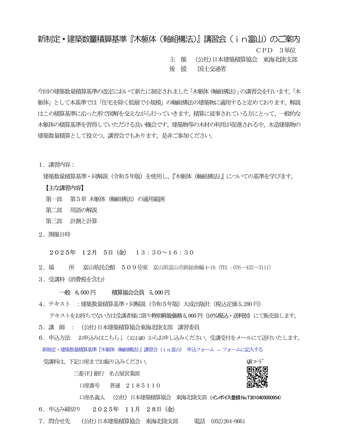 新制定・建築数量積算基準『木躯体(軸組構法)』講習会(in富山)のご案内
