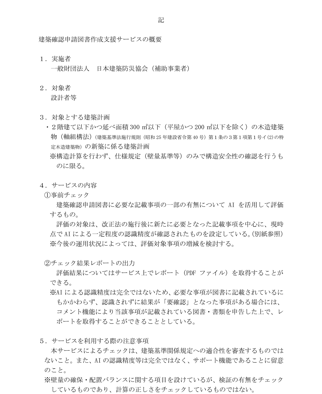 表記について、(一財)日本建築防災協会において、建築確認申請図書において記載が必要な事項のうち主要な事項について、申請予定図書等における記載の有無をAIが評価するサービスの提供を開始しますのでご連絡します。