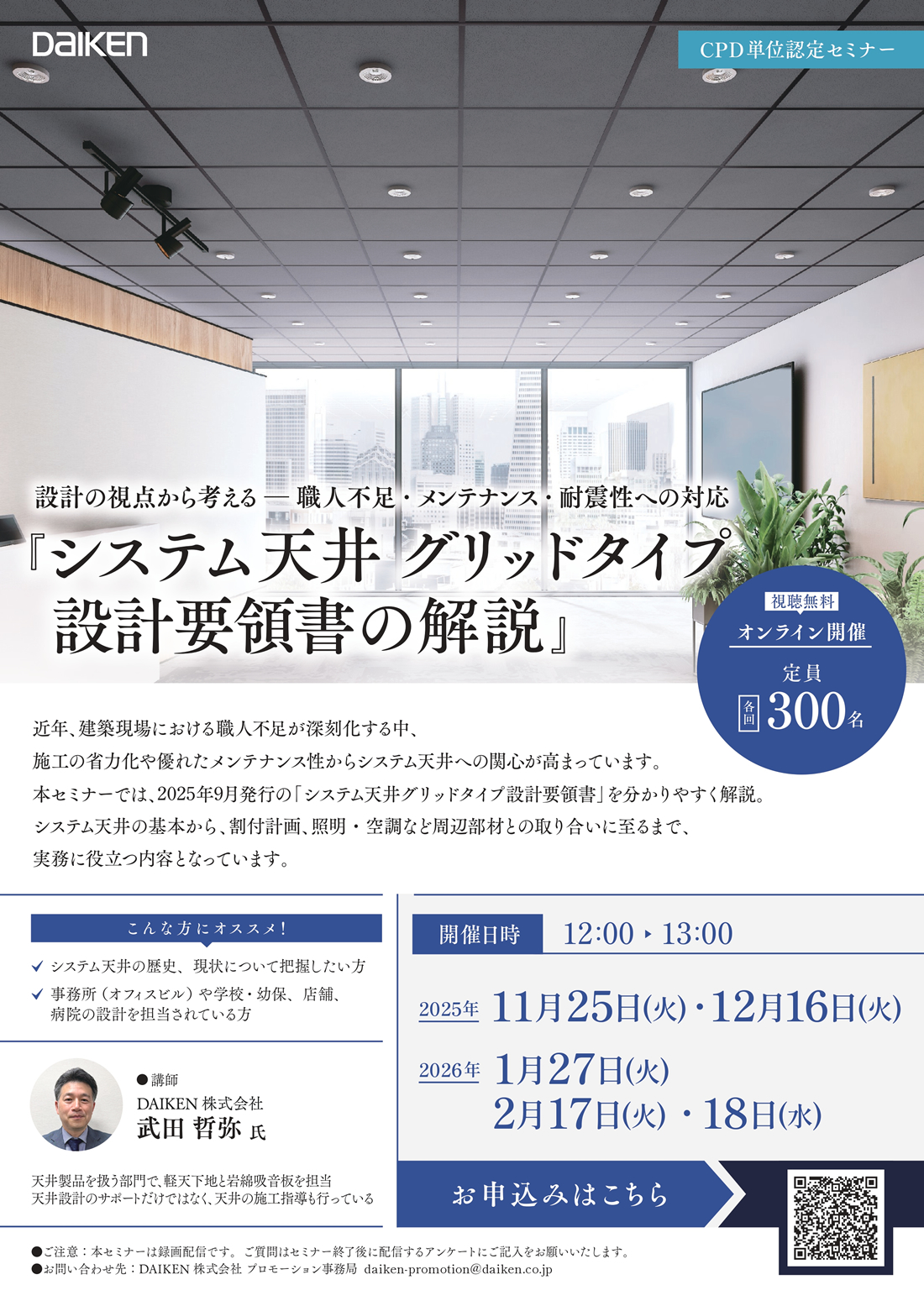 【DAIKEN】「システム天井グリッドタイプ設計要領書の解説」セミナーのご案内 公開日: 2025年11月14日 DAIKEN株式会社よりのご案内です。 添付ファイル 「システム天井グリッドタイプ設計要領書の解説」セミナーご案内.pdf