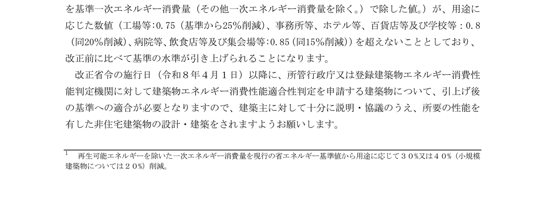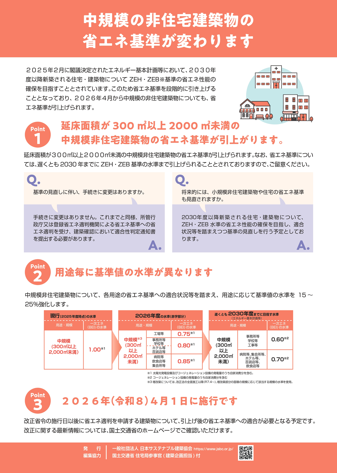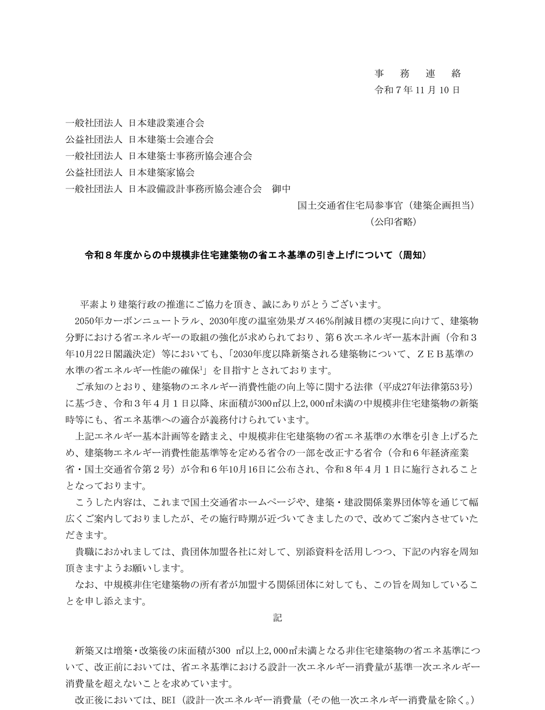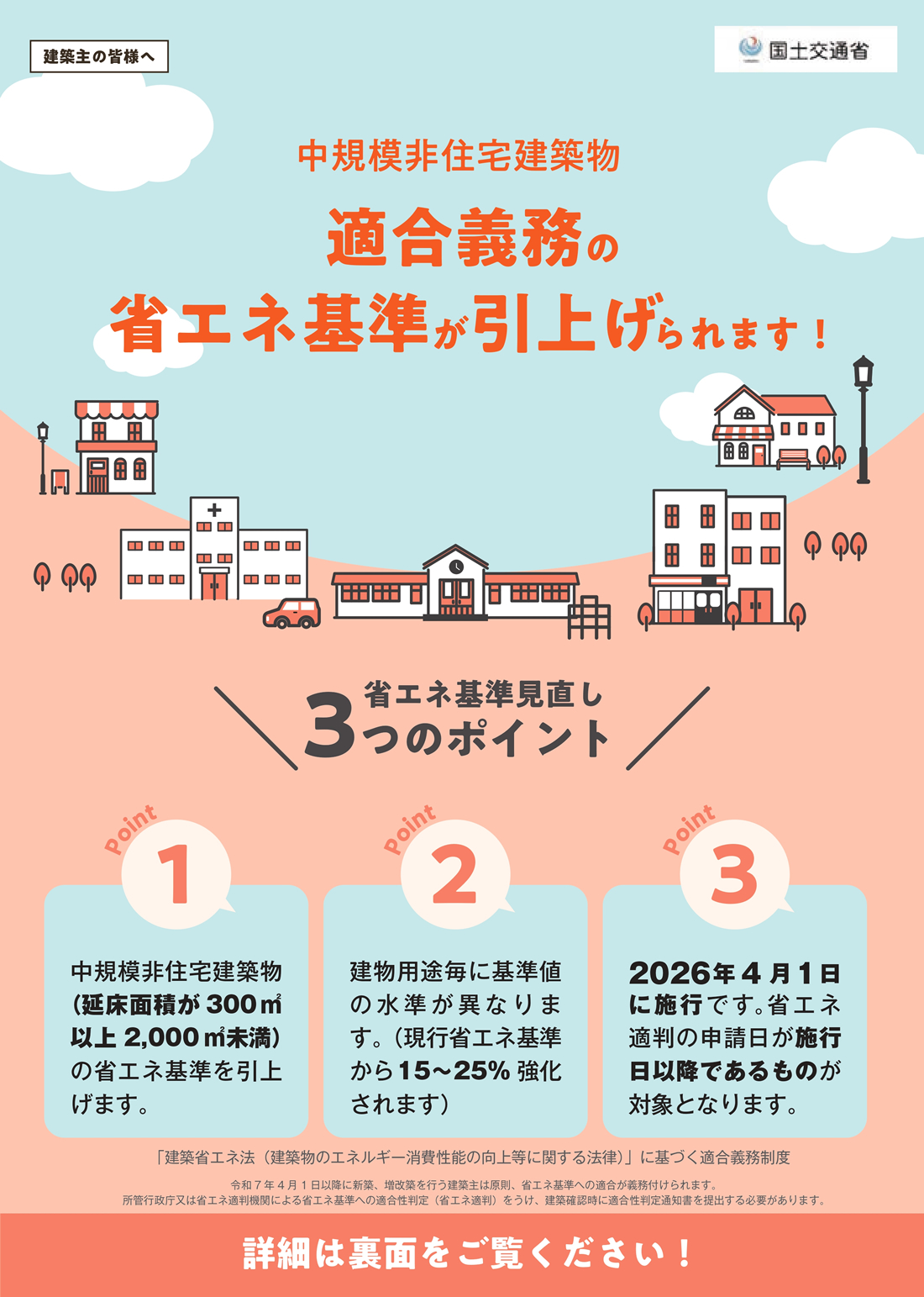 【国交省】令和8年度からの中規模非住宅建築物の省エネ基準の引き上げについて 公開日: 2025年11月17日 国交省より、令和8年度からの中規模非住宅建築物の省エネ基準の引き上げについて、施行時期が近づいてきたため周知がありましたので、共有いたします。 添付ファイル 令和8年度からの中規模非住宅建築物の省エネ基準の引き上げについて(設計者).pdf 別添資料1_2026年4月施行_中規模非住宅省エネ基準引上げチラシ.pdf 別添資料2_中規模非住宅の省エネ設計かんたんガイド.pdf 別添資料3_中規模非住宅の省エネ設計かんたんガイド(縮冊編).pdf