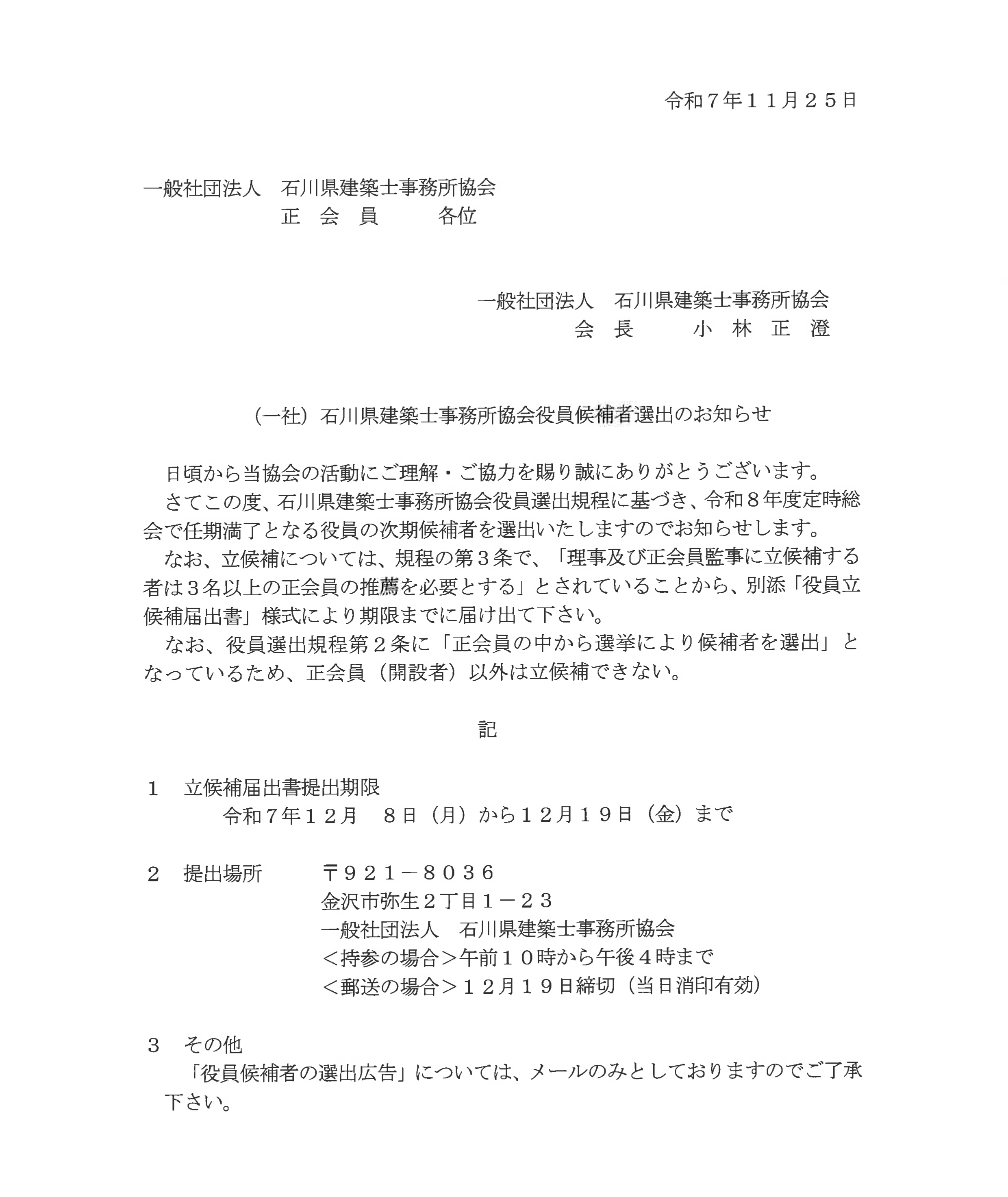 (一社)石川県建築士事務所協会役員候補者選出のお知らせ