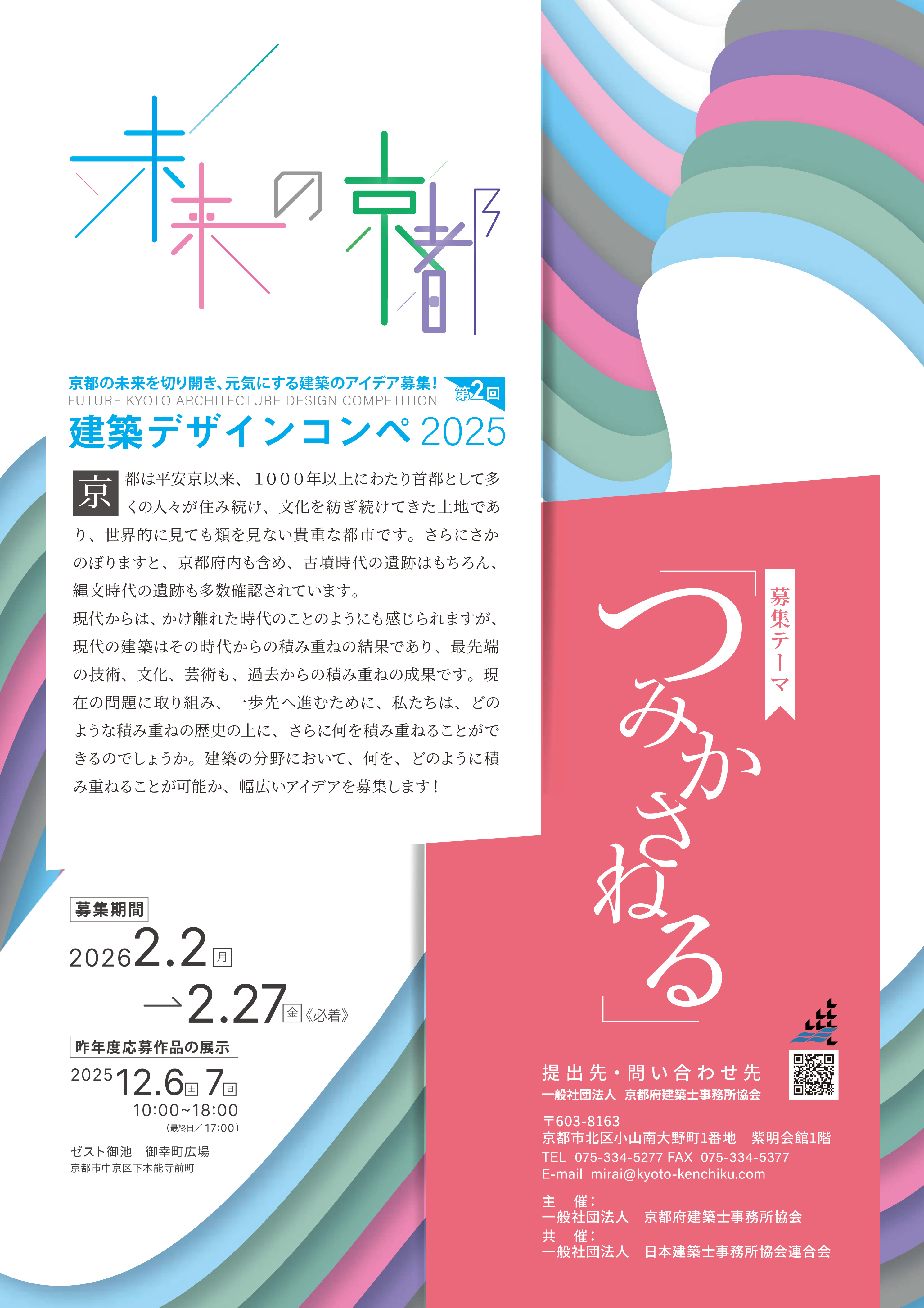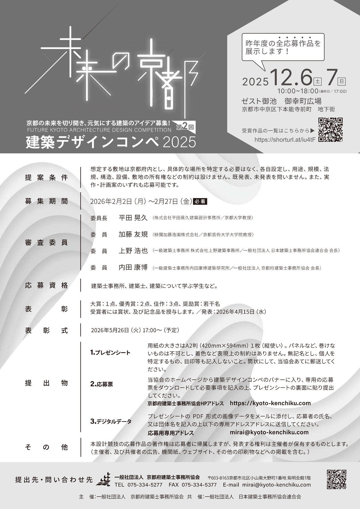 このコンペを通じて、建築にかかわるものとして、社会にいかに貢献できるかを競い合い、磨きあうことで、よりよい京都の未来を切り開くための大きな力となることを祈念するものです。
