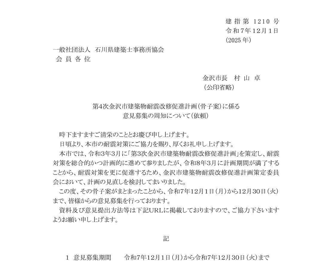 【金沢市】第4次金沢市建築物耐震改修促進計画に係る意見募集について