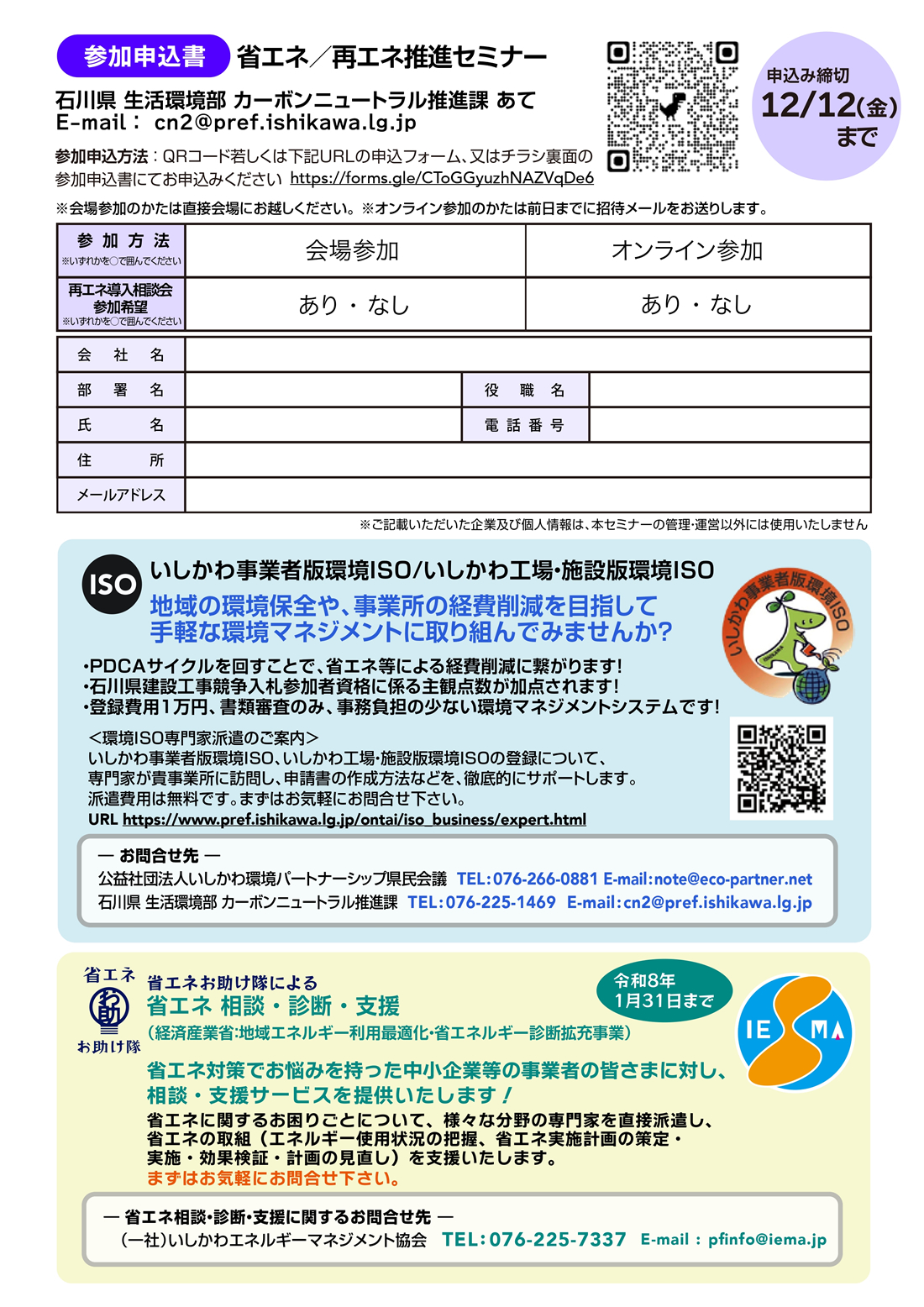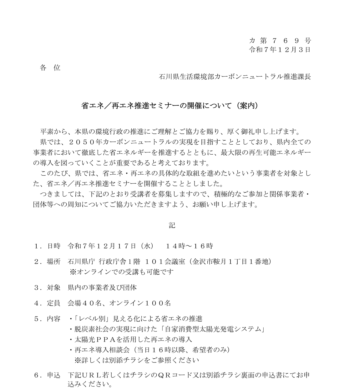 【石川県主催】省エネ/再エネ推進セミナーの開催について