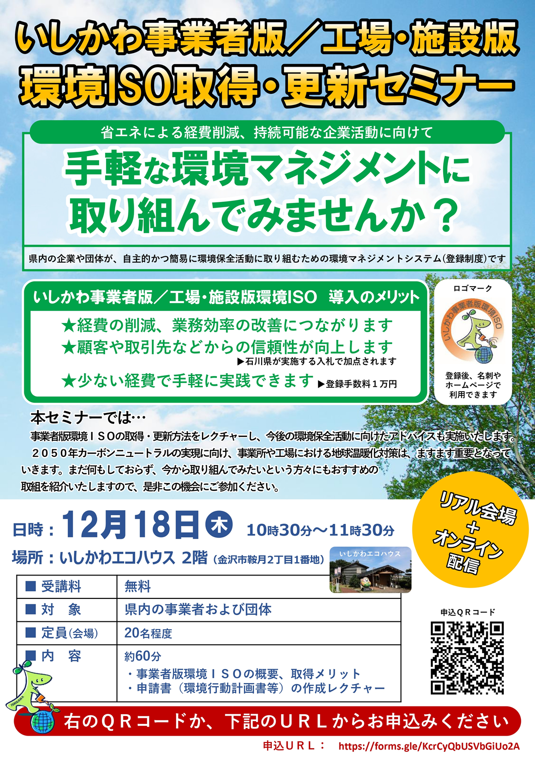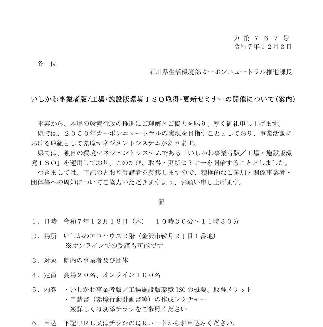 【石川県主催】いしかわ事業者版/工場・施設版環境ISO取得・更新セミナーの開催について 公開日: 2025年12月4日 石川県生活環境部からのご案内です 添付ファイル (案内)事業者版ISO取得・更新セミナー.pdf
