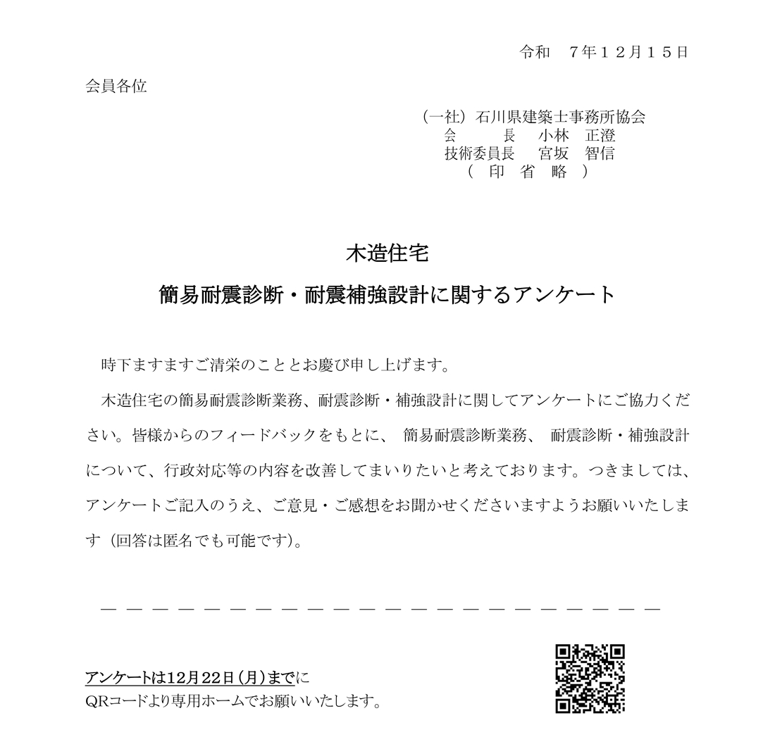 【12/22締切】木造住宅 簡易耐震診断・耐震補強設計に関するアンケートにご協力お願いします 公開日: 2025年12月17日 添付ファイル 【木造住宅】簡易耐震・耐震補強設計に関するアンケート.docx