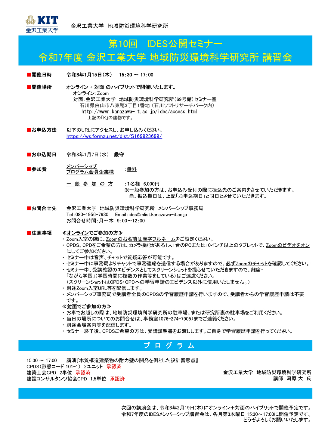 【1/7締切】令和7年度第10回金沢工業大学IDESメンバーシップ講習会開催のご案内 公開日: 2025年12月23日 添付ファイル IDESセミナー案内_令和7年度第10回講習会_2.pdf 受付フォーム申込方法.pdf