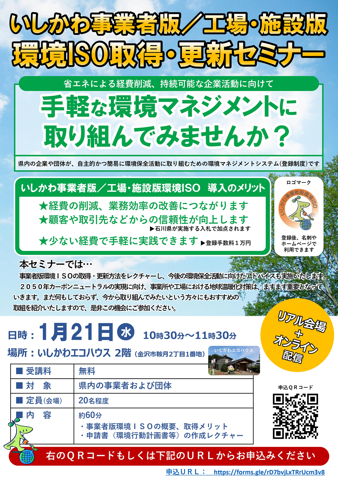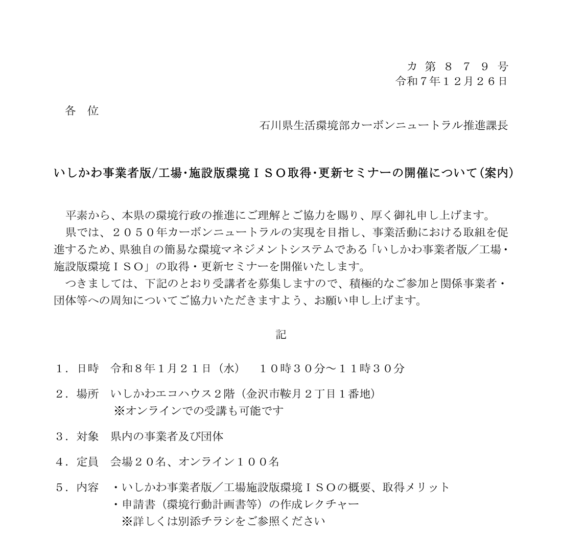 【石川県主催】いしかわ版環境ISO取得更新セミナーのご案内