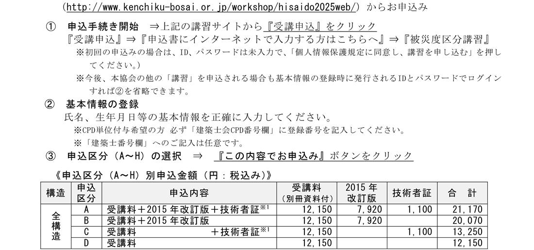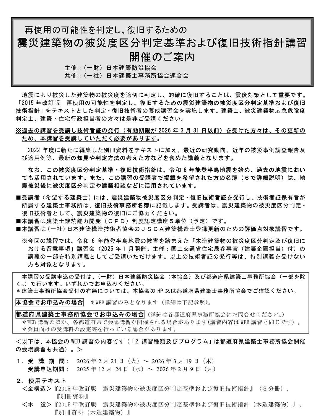 【建防協】被災度区分判定基準および復旧技術指針講習のご案内(〆切2/9) 公開日: 2026年1月14日 (一財)日本建築防災協会主催の「被災度区分判定基準および復旧技術指針講習」のご案内です。 添付ファイル R07被災度区分講習_受講案内.pdf