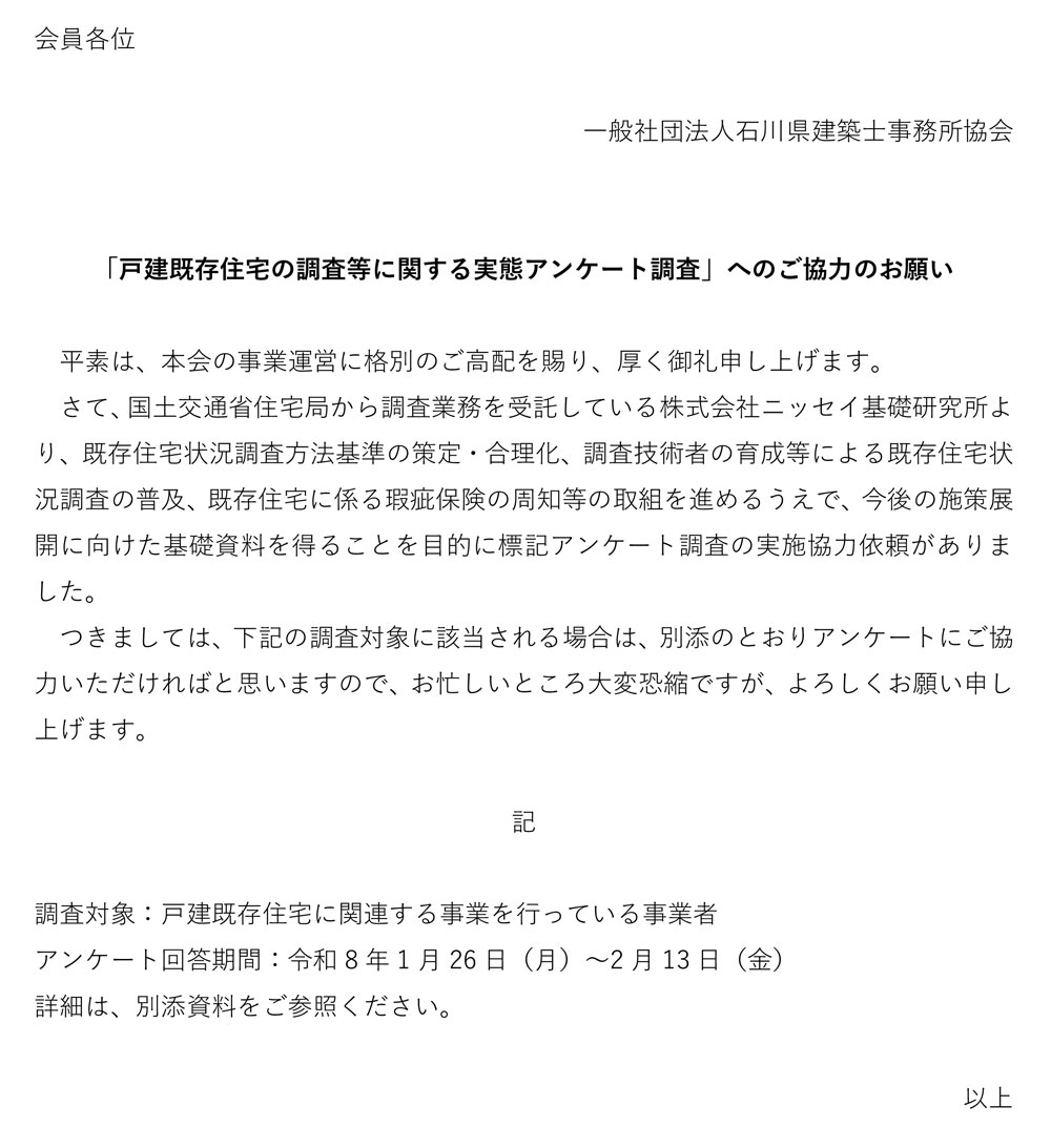【国交省】「戸建既存住宅の調査等に関する実態アンケート調査」へのご協力のお願い 公開日: 2026年1月26日 添付ファイル 戸建既存住宅の調査等に関する実態アンケート調査(国交省依頼状).pdf 戸建既存住宅の調査等に関する実態アンケート調査案内状(ニッセイ基礎研究所).pdf