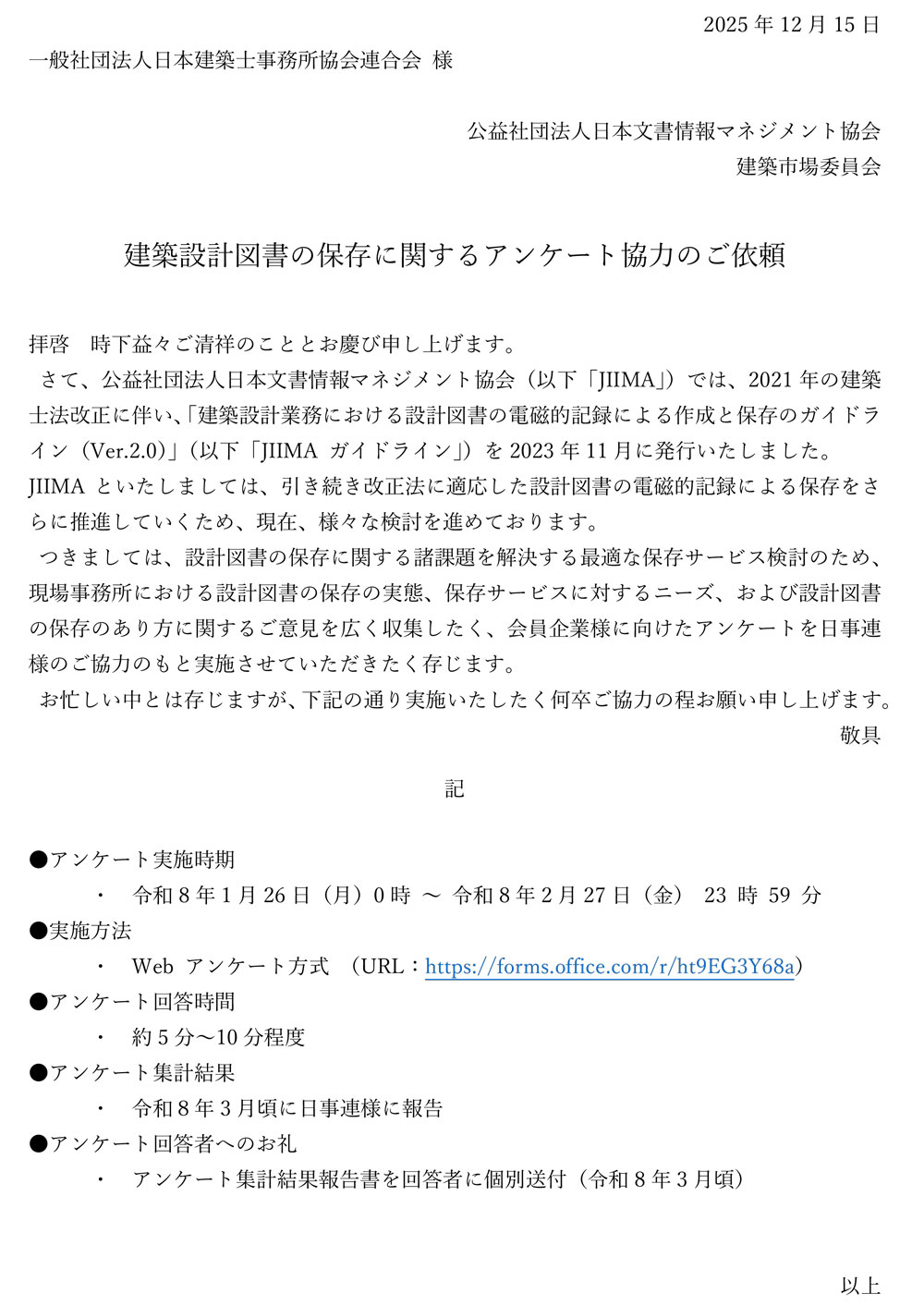 【JIIMA】建築設計図書の管理に関するアンケート協力のお願い 公開日: 2026年1月26日 公益社団法人日本文書情報マネジメント協会(JIIMA)より下記のとおりアンケートの依頼がありましたので、ご協力方よろしくお願いいたします。 添付ファイル 建築設計図書の管理に関するアンケート協力のお願い.docx