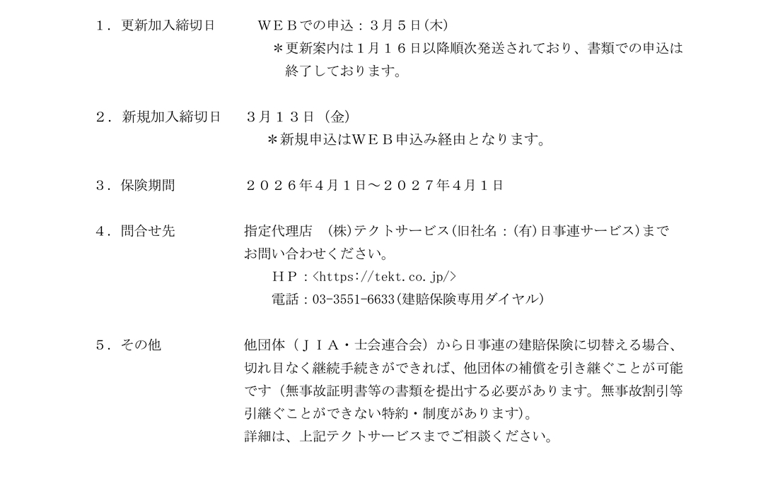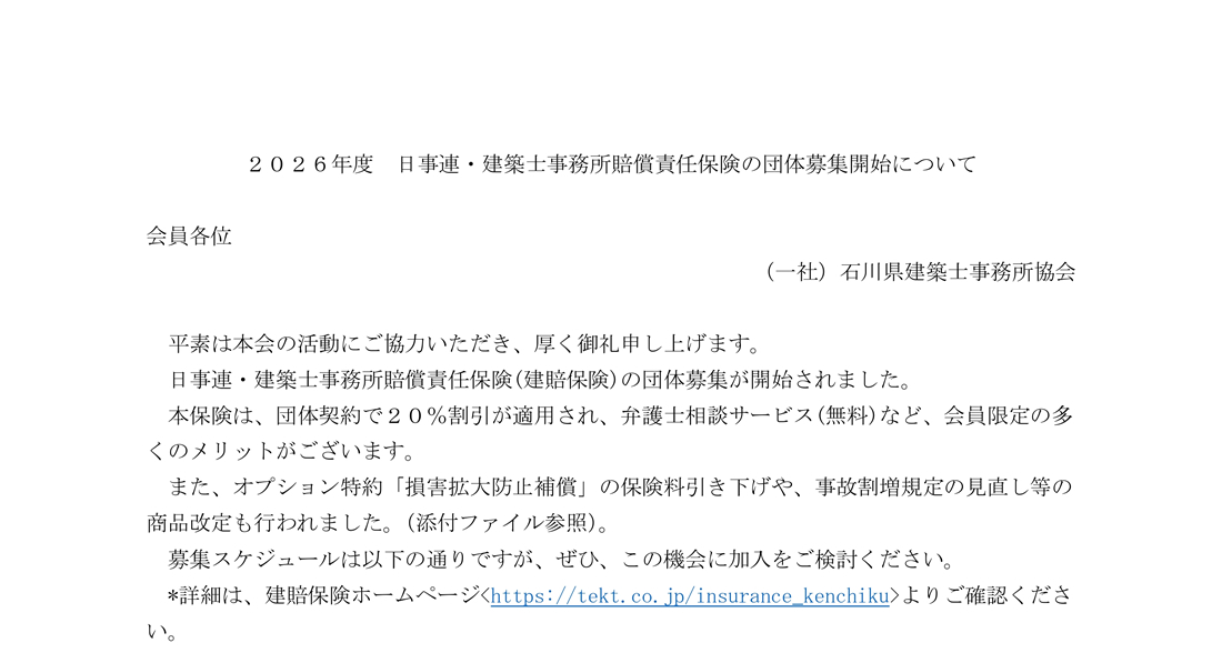 【(株)テクトサービス】2026年度 日事連・建築士事務所賠償責任保険の団体募集開始について 公開日: 2026年2月10日 添付ファイル 2026年度 日事連・建築士事務所賠償責任保険の団体募集開始について.docx 2026年度建賠保険チラシ.pdf 事故事例チラシ(新規).pdf