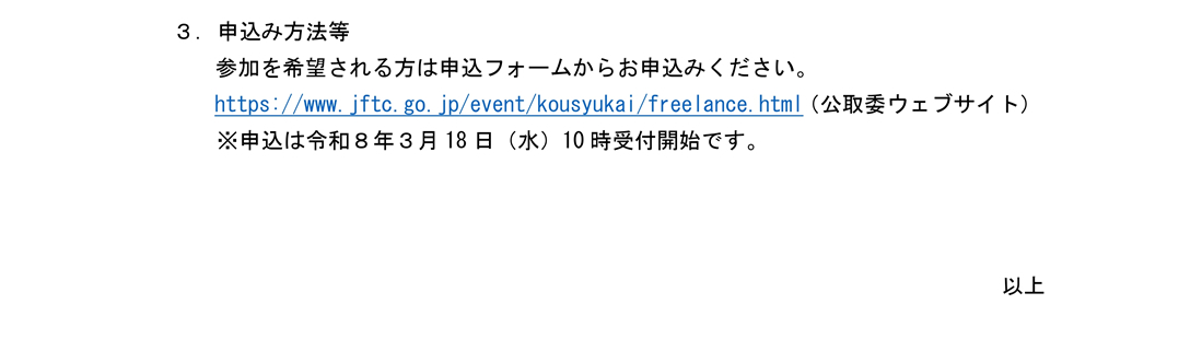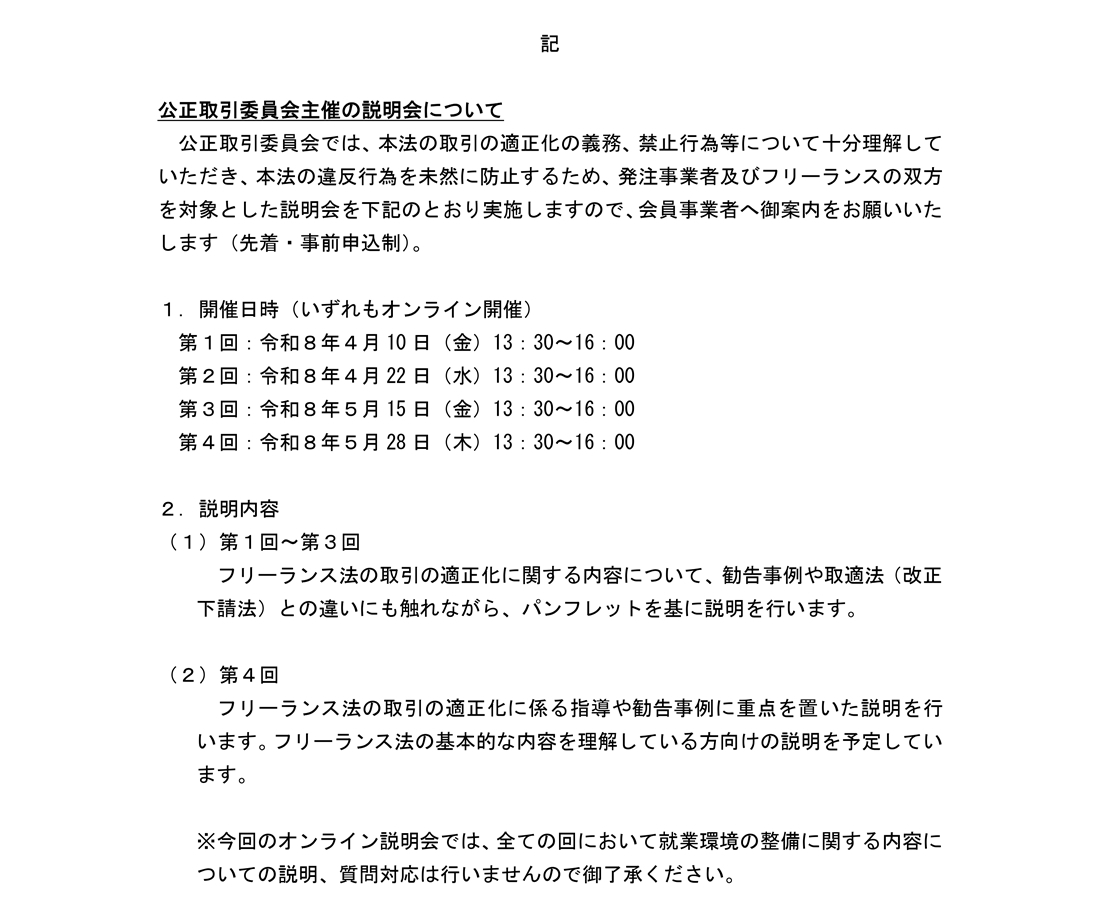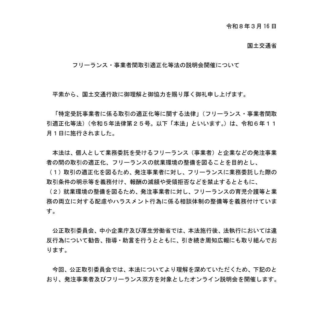 【国交省】フリーランス・事業者間取引適正化等法の説明会開催について 公開日: 2026年3月18日 国交省からのお知らせです。 添付ファイル フリーランス・事業者間取引適正化等法の説明会開催について.pdf
