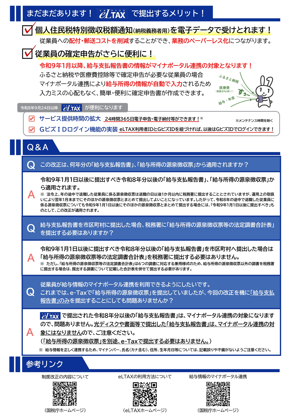 令和9年1月1日以後に提出する給与所得の源泉徴収票については、事業者の提出事務の負担軽減を目的として、市区町村へ給与支払報告書を提出した場合に税務署への提出が不要(みなし提出の特例)となります。