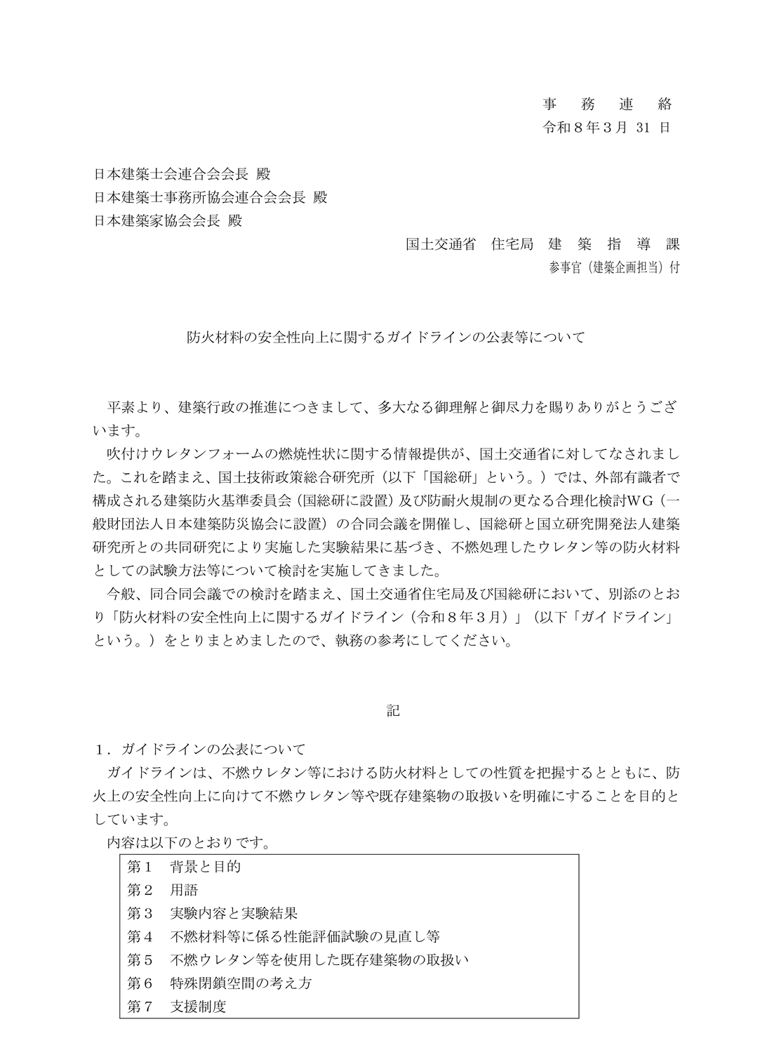 【国交省】防火材料安全性向上ガイドラインの公表について 公開日: 2026年4月1日 防火材料安全性向上ガイドラインについての事前周知を2026.3.25にホームページに掲載しましたが、改めて国土交通省より周知がありましたので、お知らせいたします。 添付ファイル 防火材料の安全性向上について.pdf