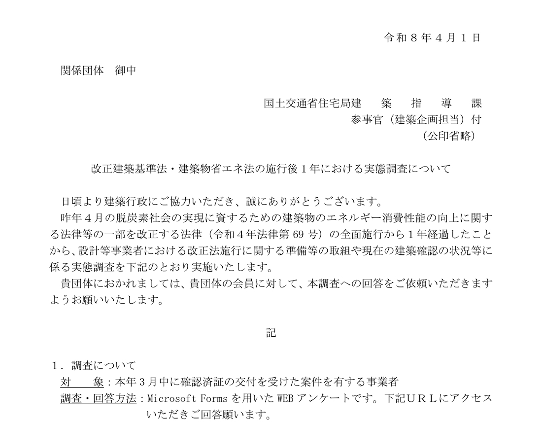 【国交省協力依頼:4/10回答〆切】改正建築基準法・建築物省エネ法の施行後1年における実態調査について