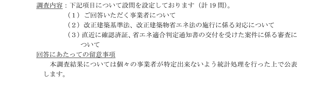昨年4月の脱炭素社会の実現に資するための建築物のエネルギー消費性能の向上に関する法律等の一部を改正する法律(令和4年法律第69号)の全面施行から1年経過したことから、設計等事業者における改正法施行に関する準備等の取組や現在の建築確認の状況等に係る実態調査を下記のとおり実施いたします。